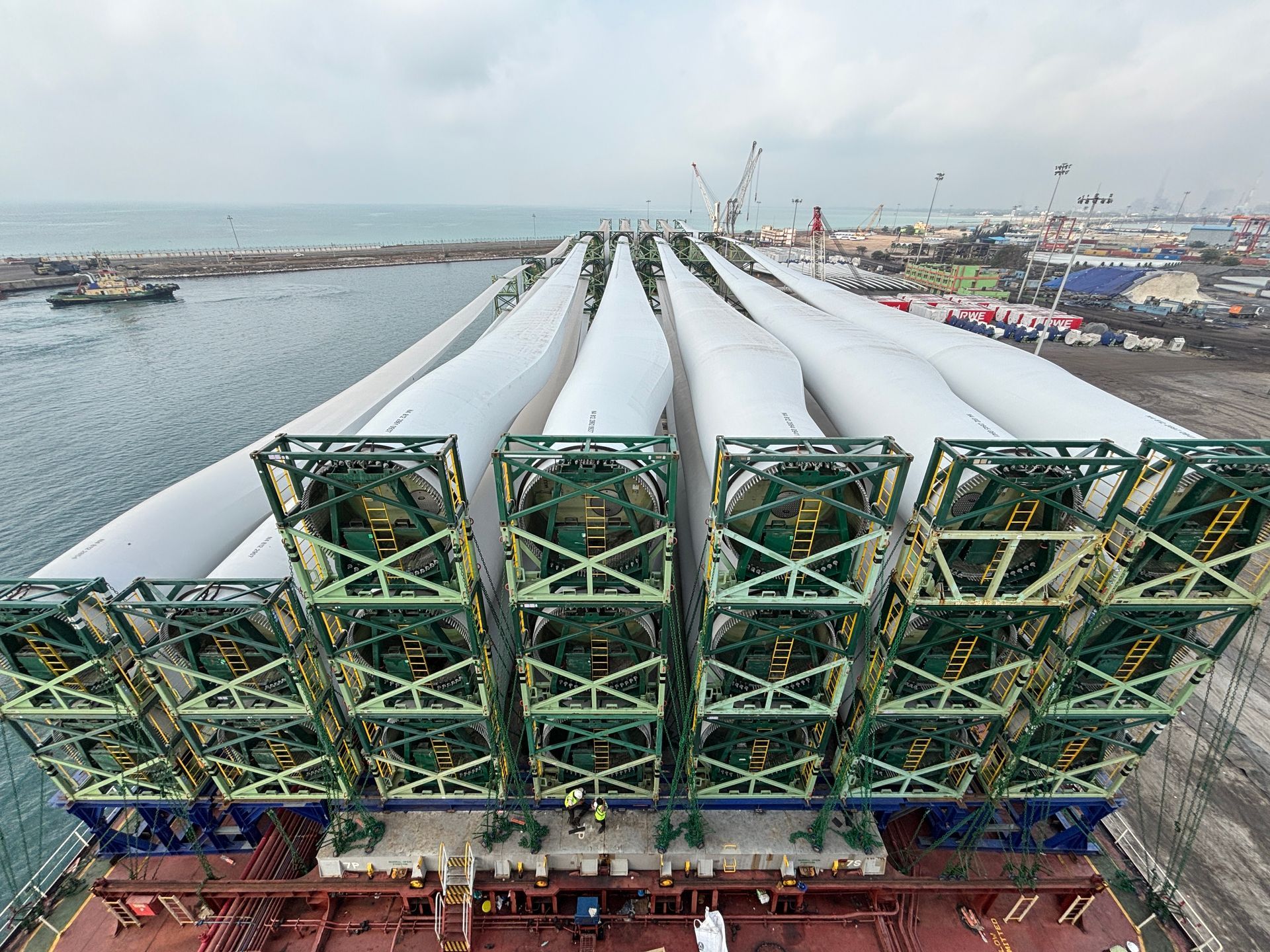 A total of 38 windmill blades were loaded for this voyage, stowed on both the hatch covers and deck area in a three-tier loading arrangement. Each blade measures 81.5 meters in length, with a unit weight of 32.21 metric tons. The transportation of such oversized cargo posed significant technical requirements in terms of loading design, cargo securing arrangements, and navigational safety.